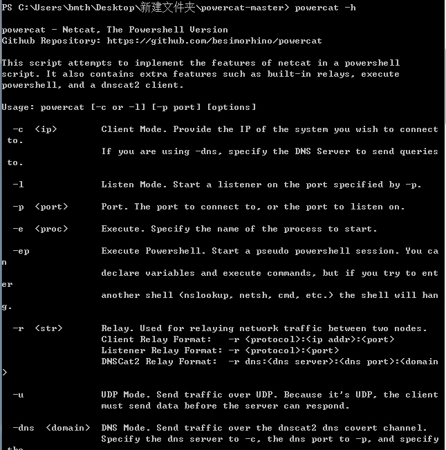 首先导入Import-Module .\powercat.ps1,然后执行powercat -h