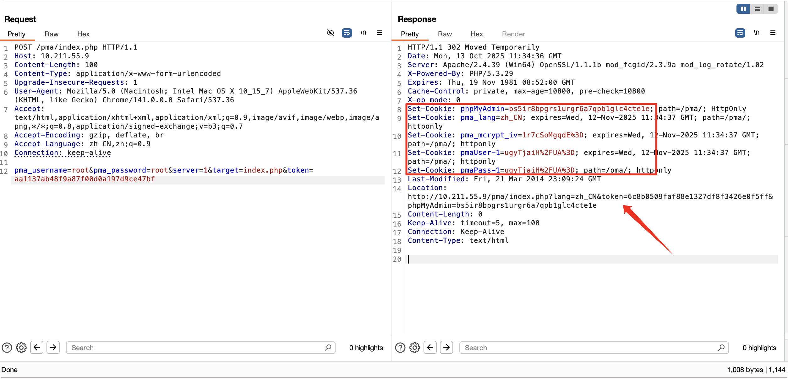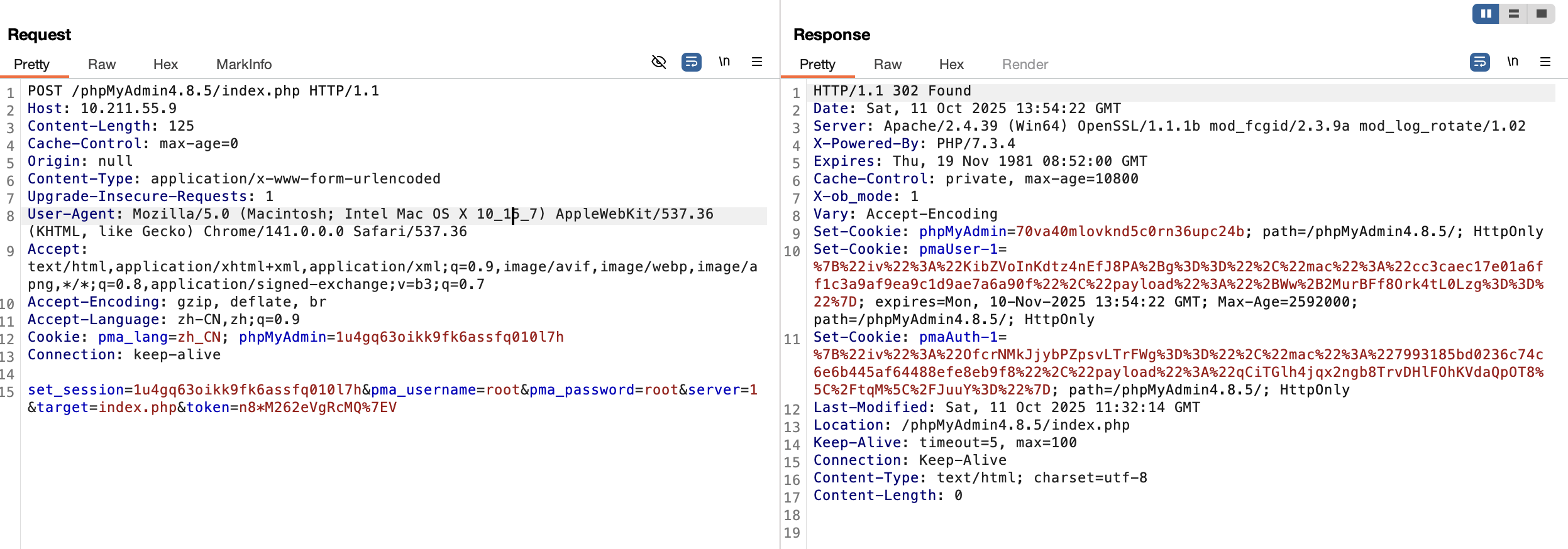 哪有这么简单,在测试版本phpMyAdmin-4.1.10的时候发现,在登录的时候不管正确与否都是直接302跳转的。。。